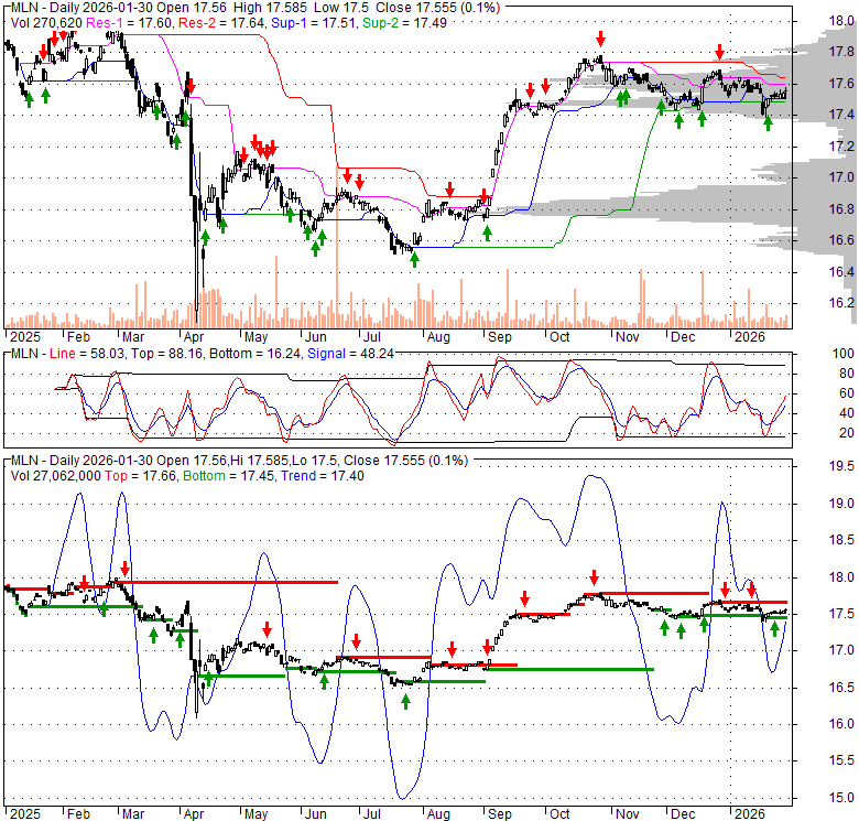 Price has closed above its short-term moving average. Short-term moving average is currently below mid-term; and below long-term moving average. From the relationship between price and moving averages: This stock is NEUTRAL in short-term; and BEARISH in mid-long term.[ MLN ] has closed below upper band by 38.9%. Bollinger Bands are 40.4% narrower than normal. The narrow width of the bands suggests low volatility as compared to its normal range. The bands have been in this narrow range for 0 bars. This is a sign that the market may be about to initiate a new trend.