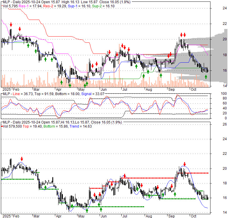 Price has closed below its short-term moving average. Short-term moving average is currently below mid-term; and below long-term moving average. From the relationship between price and moving averages: This stock is BEARISH in short-term; and NEUTRAL in mid-long term.[ MLP ] has closed above bottom band by 28.0%. Bollinger Bands are 12.1% narrower than normal. The current width of the bands does not suggest anything about the future direction or movement of prices.
