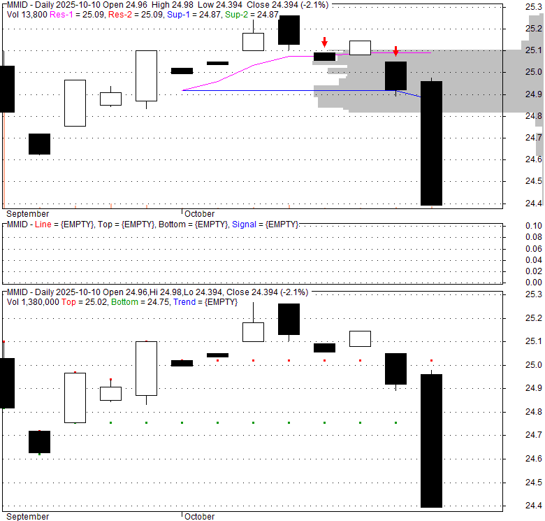 Price has closed below its short-term moving average. Short-term moving average is currently below mid-term; and below long-term moving average. From the relationship between price and moving averages: This stock is NEUTRAL in short-term; and NEUTRAL in mid-long term.[ MMID ] has closed Bollinger Bands are 0% narrower than normal.