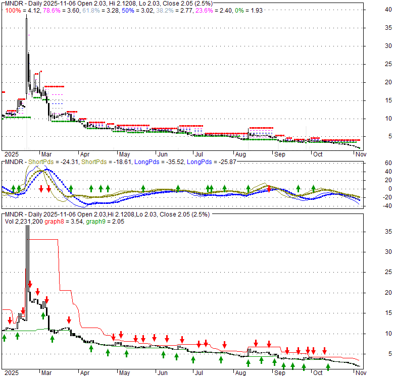 Price has closed below its short-term moving average. Short-term moving average is currently below mid-term; and below long-term moving average. From the relationship between price and moving averages: This stock is BEARISH in short-term; and BEARISH in mid-long term.[ MNDR ] has closed above bottom band by 10.1%. Bollinger Bands are 24% wider than normal. The current width of the bands does not suggest anything about the future direction or movement of prices.