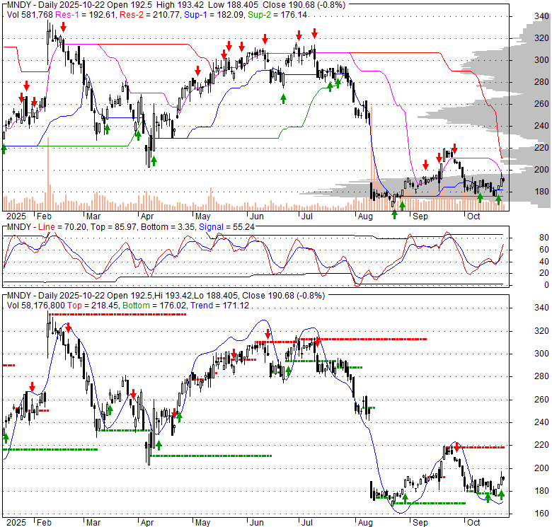 Price has closed above its short-term moving average. Short-term moving average is currently below mid-term; and below long-term moving average. From the relationship between price and moving averages: This stock is NEUTRAL in short-term; and BEARISH in mid-long term.[ MNDY ] has closed below upper band by 17.1%. Bollinger Bands are 65.6% narrower than normal. The narrow width of the bands suggests low volatility as compared to its normal range. The bands have been in this narrow range for 3 bars. This is a sign that the market may be about to initiate a new trend.