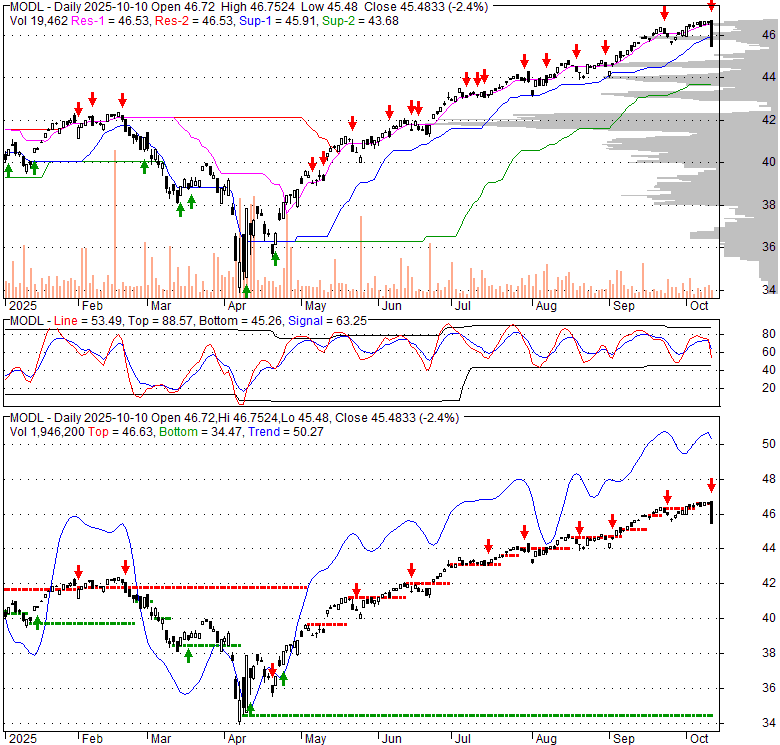 Price has closed below its short-term moving average. Short-term moving average is currently above mid-term; and above long-term moving average. From the relationship between price and moving averages: This stock is NEUTRAL in short-term; and BULLISH in mid-long term.[ MODL ] has closed above bottom band by 5.4%. Bollinger Bands are 18.8% narrower than normal. The current width of the bands does not suggest anything about the future direction or movement of prices.