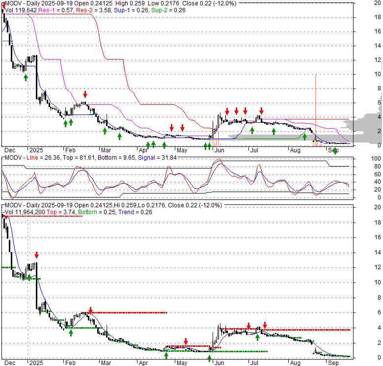 Price has closed above its short-term moving average. Short-term moving average is currently below mid-term; and below long-term moving average. From the relationship between price and moving averages: This stock is NEUTRAL in short-term; and BEARISH in mid-long term.[ MODV ] has closed above bottom band by 35.4%. Bollinger Bands are 88.6% narrower than normal. The narrow width of the bands suggests low volatility as compared to its normal range. The bands have been in this narrow range for 15 bars. This is a sign that the market may be about to initiate a new trend.