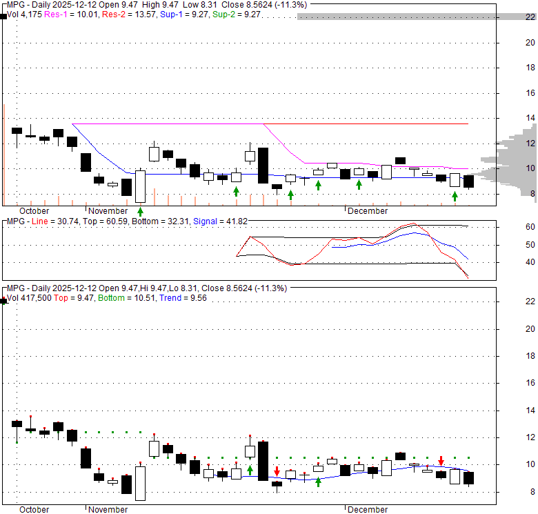 Price has closed below its short-term moving average. Short-term moving average is currently below mid-term; and below long-term moving average. From the relationship between price and moving averages: This stock is NEUTRAL in short-term; and NEUTRAL in mid-long term.[ MPG ] has closed above bottom band by 7.8%. Bollinger Bands are 0% narrower than normal.
