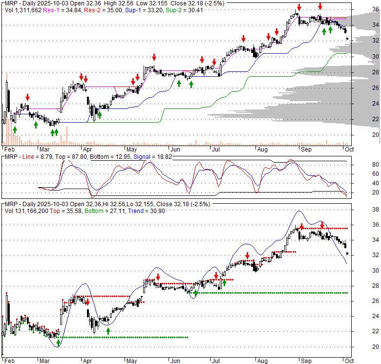 Price has closed below its short-term moving average. Short-term moving average is currently below mid-term; and above long-term moving average. From the relationship between price and moving averages: This stock is BEARISH in short-term; and NEUTRAL in mid-long term.[ MRP ] has closed below the lower bollinger band by 15.3%. If price is in a downtrend band; this downward trend might continue. However a short term pullback inside the band is likely. Bollinger Bands are 2.9% wider than normal. The current width of the bands does not suggest anything about the future direction or movement of prices.