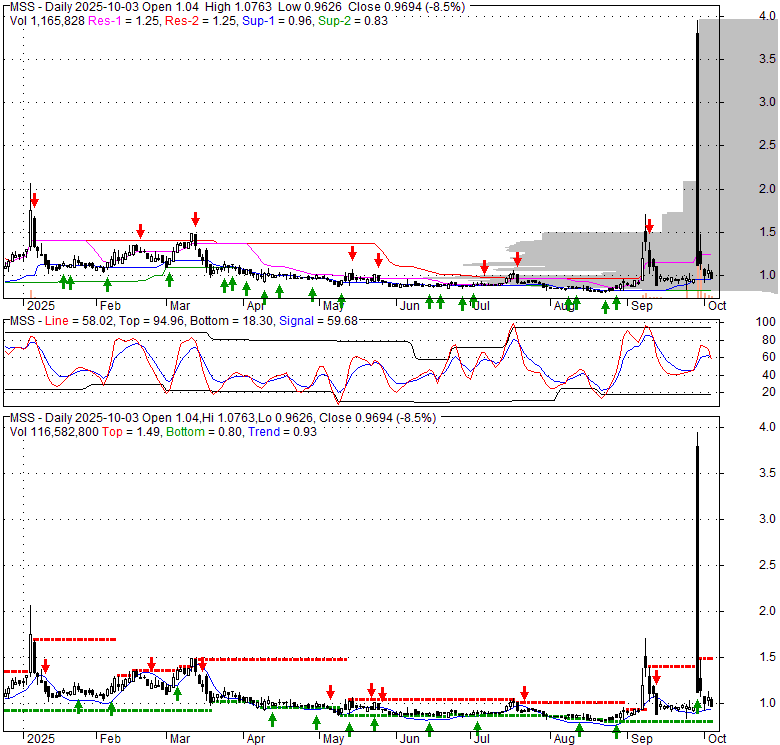 Price has closed below its short-term moving average. Short-term moving average is currently above mid-term; and above long-term moving average. From the relationship between price and moving averages: This stock is NEUTRAL in short-term; and BULLISH in mid-long term.[ MSS ] has closed above bottom band by 38.9%. Bollinger Bands are 26.2% wider than normal. The current width of the bands does not suggest anything about the future direction or movement of prices.