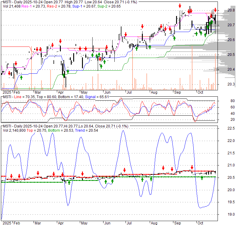 Price has closed above its short-term moving average. Short-term moving average is currently above mid-term; and above long-term moving average. From the relationship between price and moving averages: This stock is BULLISH in short-term; and BULLISH in mid-long term.[ MSTI ] has closed below upper band by 13.9%. Bollinger Bands are 3.2% wider than normal. The current width of the bands does not suggest anything about the future direction or movement of prices.