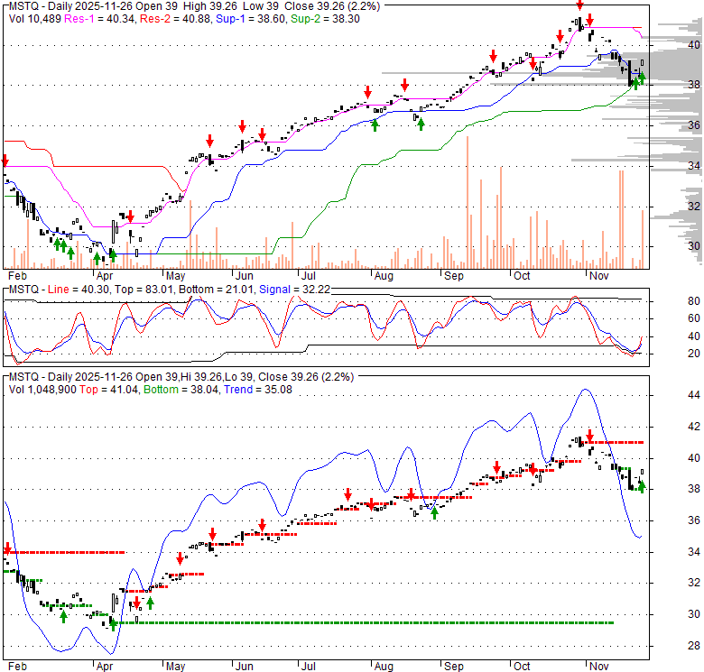 Price has closed above its short-term moving average. Short-term moving average is currently below mid-term; and above long-term moving average. From the relationship between price and moving averages: This stock is NEUTRAL in short-term; and NEUTRAL in mid-long term.[ MSTQ ] has closed below upper band by 47.4%. Bollinger Bands are 64.5% wider than normal. The large width of the bands suggest high volatility as compared to its normal range. The bands have been in this wide range for 9 days. This is a sign that the current trend might continue.