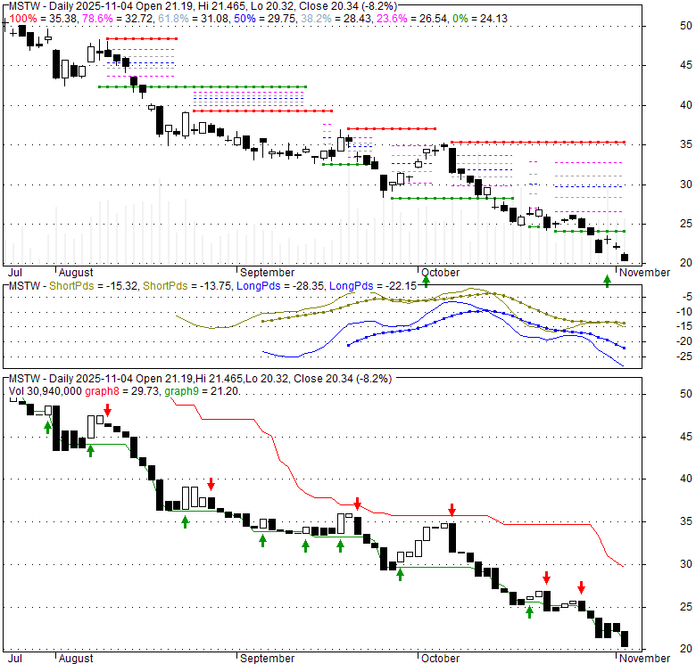 Price has closed below its short-term moving average. Short-term moving average is currently below mid-term; and below long-term moving average. From the relationship between price and moving averages: This stock is BEARISH in short-term; and NEUTRAL in mid-long term.[ MSTW ] has closed below the lower bollinger band by 4.7%. Although price has broken the lower band and a downside breakout is possible; the most likely direction for [ MSTW ] is to continue within current trading range. Bollinger Bands are 0% narrower than normal.