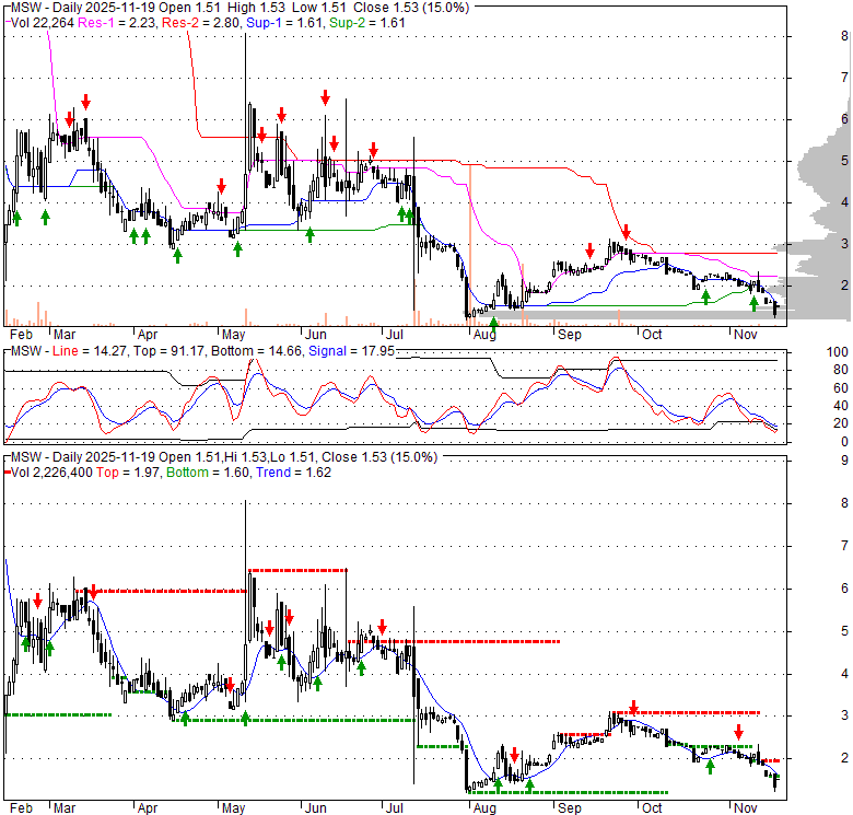 Price has closed below its short-term moving average. Short-term moving average is currently below mid-term; and below long-term moving average. From the relationship between price and moving averages: This stock is BEARISH in short-term; and BEARISH in mid-long term.[ MSW ] has closed above bottom band by 14.7%. Bollinger Bands are 11.1% narrower than normal. The current width of the bands does not suggest anything about the future direction or movement of prices.