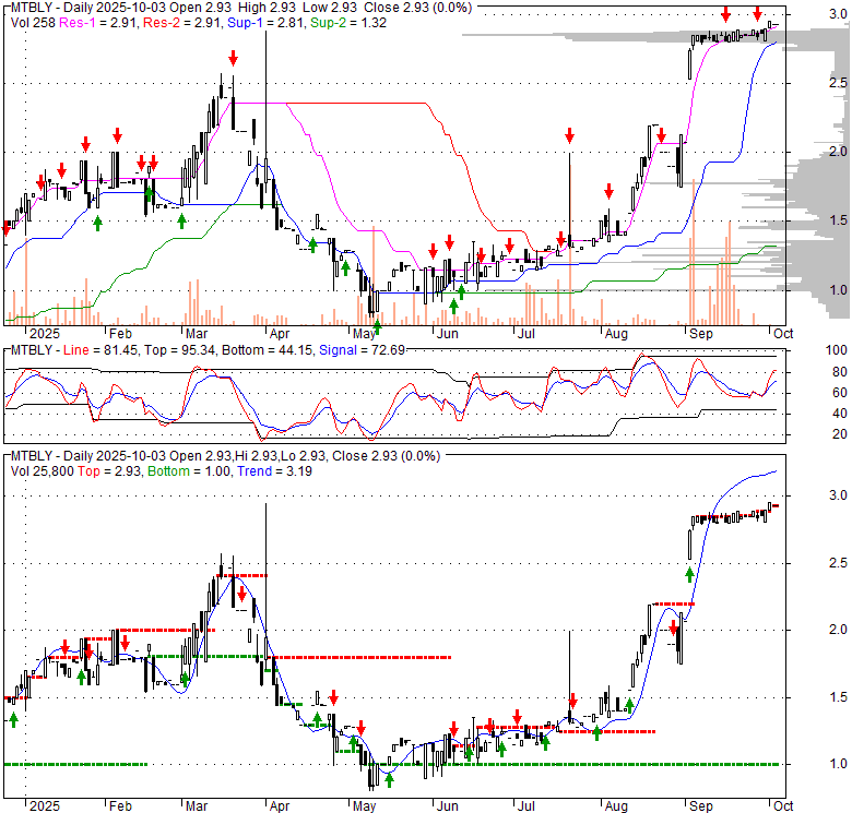 Price has closed above its short-term moving average. Short-term moving average is currently above mid-term; and above long-term moving average. From the relationship between price and moving averages: This stock is BULLISH in short-term; and BULLISH in mid-long term.[ MTBLY ] has closed below upper band by 13.6%. Bollinger Bands are 71.5% narrower than normal. The narrow width of the bands suggests low volatility as compared to its normal range. The bands have been in this narrow range for 8 bars. This is a sign that the market may be about to initiate a new trend.