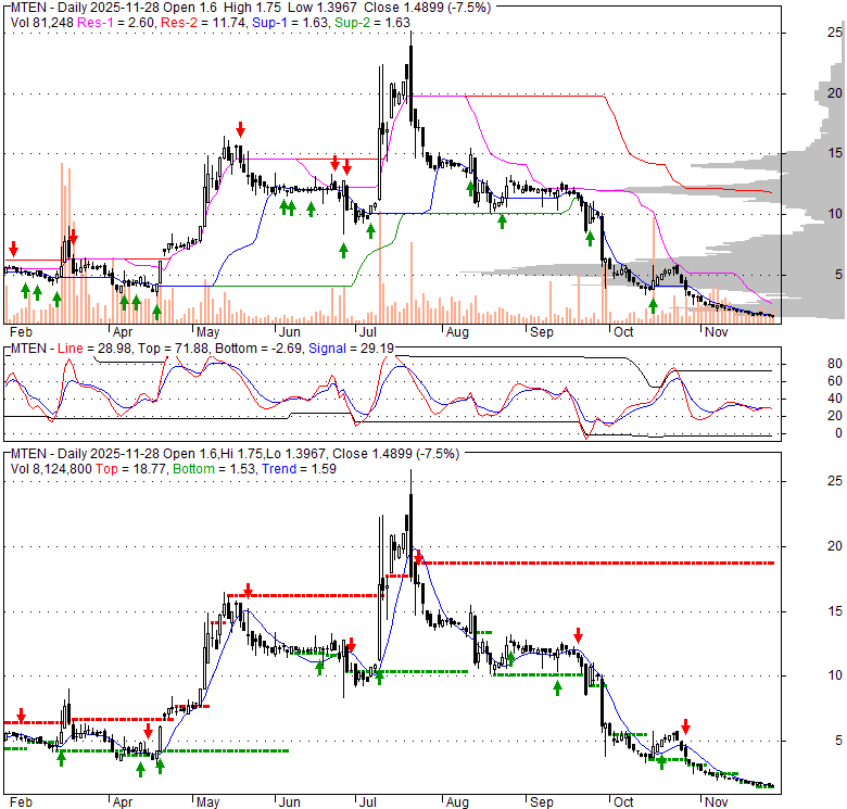 Price has closed below its short-term moving average. Short-term moving average is currently below mid-term; and below long-term moving average. From the relationship between price and moving averages: This stock is BEARISH in short-term; and BEARISH in mid-long term.[ MTEN ] has closed above bottom band by 12.1%. Bollinger Bands are 81.2% narrower than normal. The narrow width of the bands suggests low volatility as compared to its normal range. The bands have been in this narrow range for 10 bars. This is a sign that the market may be about to initiate a new trend.