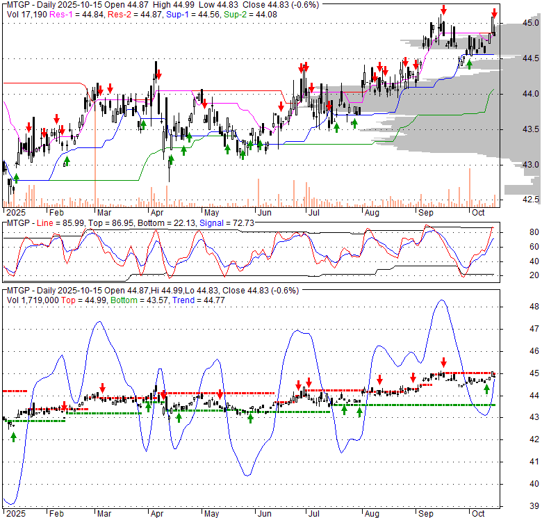 Price has closed above its short-term moving average. Short-term moving average is currently above mid-term; and above long-term moving average. From the relationship between price and moving averages: This stock is BULLISH in short-term; and BULLISH in mid-long term.[ MTGP ] has closed below upper band by 24.2%. Bollinger Bands are 5.9% narrower than normal. The current width of the bands does not suggest anything about the future direction or movement of prices.