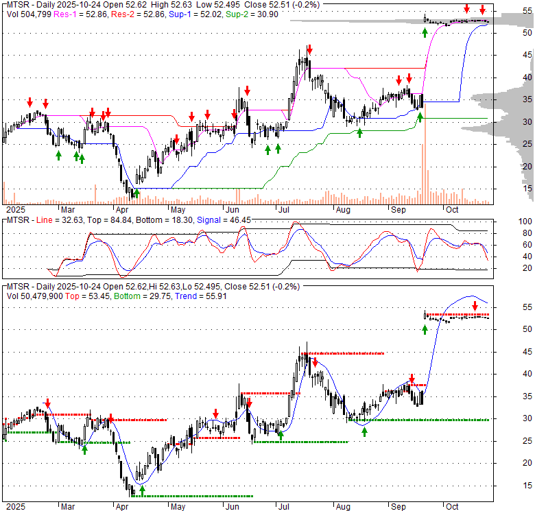 Price has closed below its short-term moving average. Short-term moving average is currently above mid-term; and above long-term moving average. From the relationship between price and moving averages: This stock is NEUTRAL in short-term; and BULLISH in mid-long term.[ MTSR ] has closed above bottom band by 11.5%. Bollinger Bands are 94.4% narrower than normal. The narrow width of the bands suggests low volatility as compared to its normal range. The bands have been in this narrow range for 10 bars. This is a sign that the market may be about to initiate a new trend.