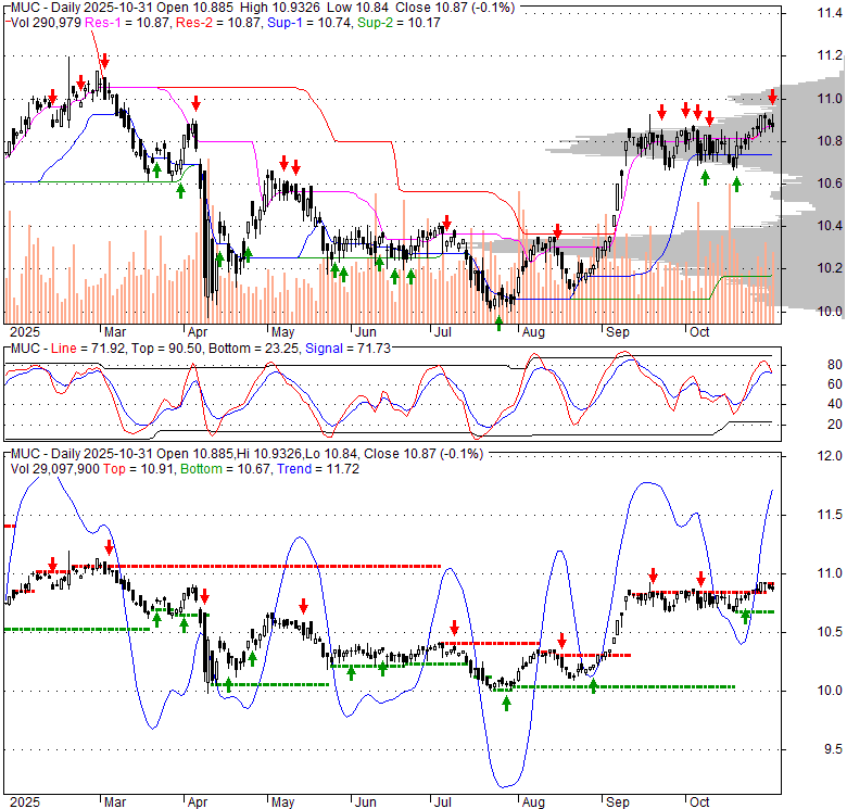 Price has closed below its short-term moving average. Short-term moving average is currently above mid-term; and above long-term moving average. From the relationship between price and moving averages: This stock is NEUTRAL in short-term; and BULLISH in mid-long term.[ MUC ] has closed below upper band by 30.0%. Bollinger Bands are 20.3% narrower than normal. The current width of the bands does not suggest anything about the future direction or movement of prices.