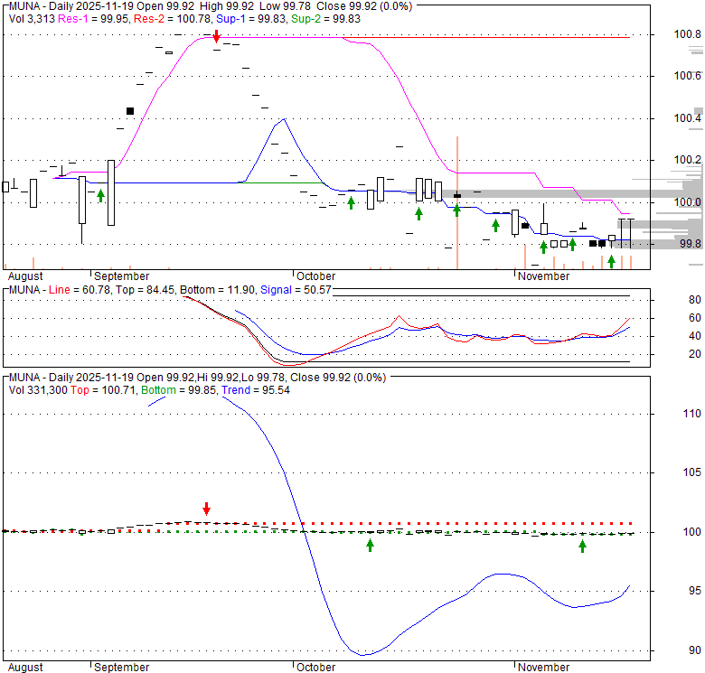Price has closed above its short-term moving average. Short-term moving average is currently below mid-term; and below long-term moving average. From the relationship between price and moving averages: This stock is NEUTRAL in short-term; and NEUTRAL in mid-long term.[ MUNA ] has closed below upper band by 30.7%. Bollinger Bands are 0% narrower than normal.
