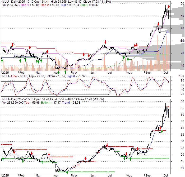 Price has closed below its short-term moving average. Short-term moving average is currently above mid-term; and above long-term moving average. From the relationship between price and moving averages: This stock is NEUTRAL in short-term; and BULLISH in mid-long term.[ MUU ] has closed below upper band by 42.2%. Bollinger Bands are 155.5% wider than normal. The large width of the bands suggest high volatility as compared to its normal range. The bands have been in this wide range for 7 days. This is a sign that the current trend might continue.
