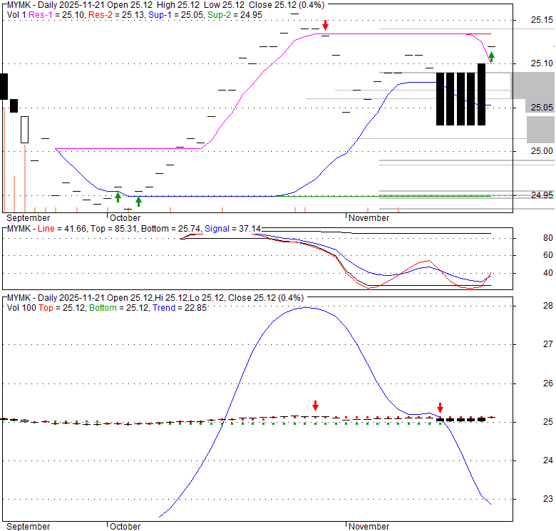 Price has closed above its short-term moving average. Short-term moving average is currently above mid-term; and below long-term moving average. From the relationship between price and moving averages: This stock is BULLISH in short-term; and NEUTRAL in mid-long term.[ MYMK ] has closed below upper band by 10.1%. Bollinger Bands are 0% narrower than normal.