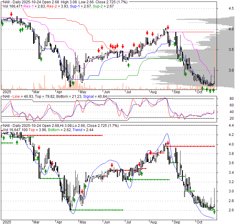 Price has closed above its short-term moving average. Short-term moving average is currently below mid-term; and below long-term moving average. From the relationship between price and moving averages: This stock is NEUTRAL in short-term; and BEARISH in mid-long term.[ NAII ] has closed below upper band by 37.6%. Bollinger Bands are 51.8% narrower than normal. The narrow width of the bands suggests low volatility as compared to its normal range. The bands have been in this narrow range for 2 bars. This is a sign that the market may be about to initiate a new trend.