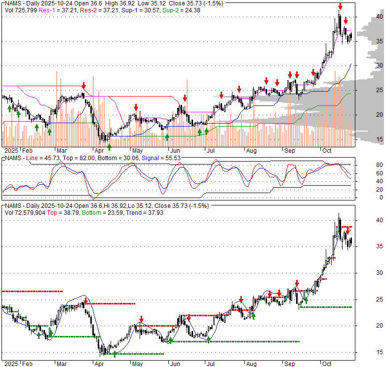 Price has closed below its short-term moving average. Short-term moving average is currently above mid-term; and above long-term moving average. From the relationship between price and moving averages: This stock is NEUTRAL in short-term; and BULLISH in mid-long term.[ NAMS ] has closed above bottom band by 49.2%. Bollinger Bands are 60.8% wider than normal. The large width of the bands suggest high volatility as compared to its normal range. The bands have been in this wide range for 17 days. This is a sign that the current trend might continue.