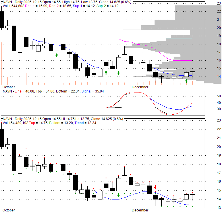 Price has closed below its short-term moving average. Short-term moving average is currently below mid-term; and below long-term moving average. From the relationship between price and moving averages: This stock is NEUTRAL in short-term; and NEUTRAL in mid-long term.[ NAVN ] has closed above bottom band by 27.3%. Bollinger Bands are 0% narrower than normal.
