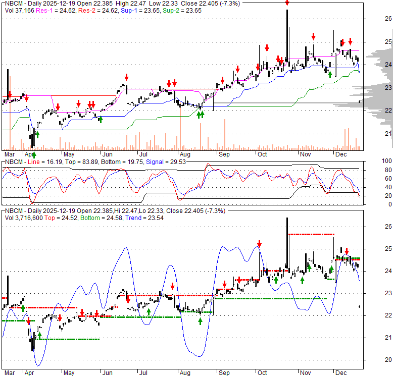 Price has closed below its short-term moving average. Short-term moving average is currently below mid-term; and above long-term moving average. From the relationship between price and moving averages: This stock is BEARISH in short-term; and NEUTRAL in mid-long term.[ NBCM ] has closed below the lower bollinger band by 37.2%. If price is in a downtrend band; this downward trend might continue. However a short term pullback inside the band is likely. Bollinger Bands are 144.7% wider than normal. The large width of the bands suggest high volatility as compared to its normal range. The bands have been in this wide range for 0 days. This is a sign that the current trend might continue.