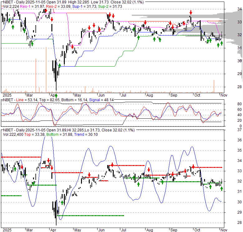 Price has closed above its short-term moving average. Short-term moving average is currently below mid-term; and below long-term moving average. From the relationship between price and moving averages: This stock is NEUTRAL in short-term; and BEARISH in mid-long term.[ NBET ] has closed below upper band by 25.4%. Bollinger Bands are 30.1% narrower than normal. The current width of the bands does not suggest anything about the future direction or movement of prices.