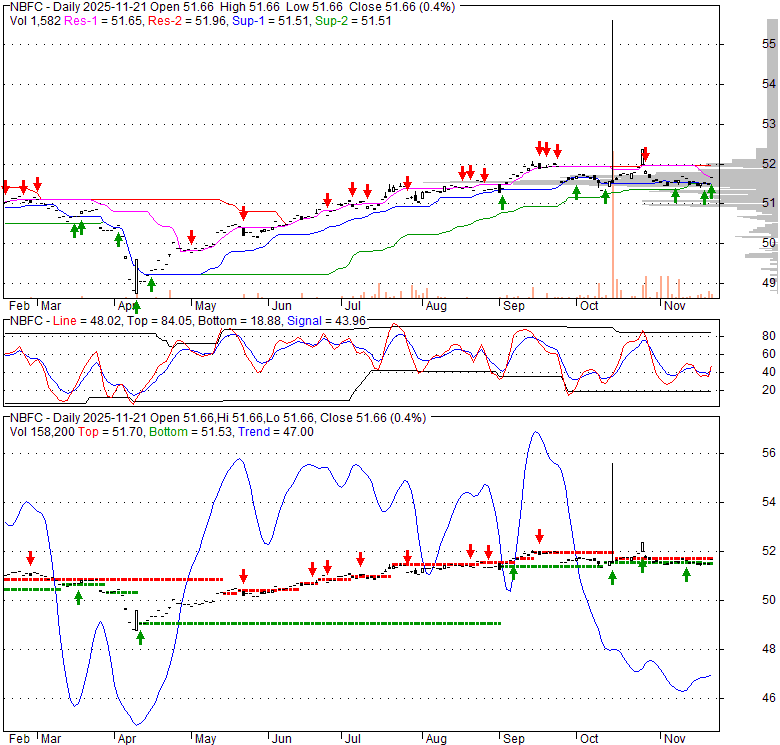 Price has closed above its short-term moving average. Short-term moving average is currently below mid-term; and above long-term moving average. From the relationship between price and moving averages: This stock is NEUTRAL in short-term; and NEUTRAL in mid-long term.[ NBFC ] has closed below upper band by 10.7%. Bollinger Bands are 52.2% narrower than normal. The narrow width of the bands suggests low volatility as compared to its normal range. The bands have been in this narrow range for 3 bars. This is a sign that the market may be about to initiate a new trend.