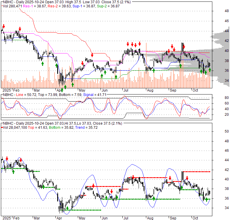 Price has closed above its short-term moving average. Short-term moving average is currently below mid-term; and below long-term moving average. From the relationship between price and moving averages: This stock is NEUTRAL in short-term; and NEUTRAL in mid-long term.[ NBHC ] has closed above bottom band by 46.7%. Bollinger Bands are 3% wider than normal. The current width of the bands does not suggest anything about the future direction or movement of prices.