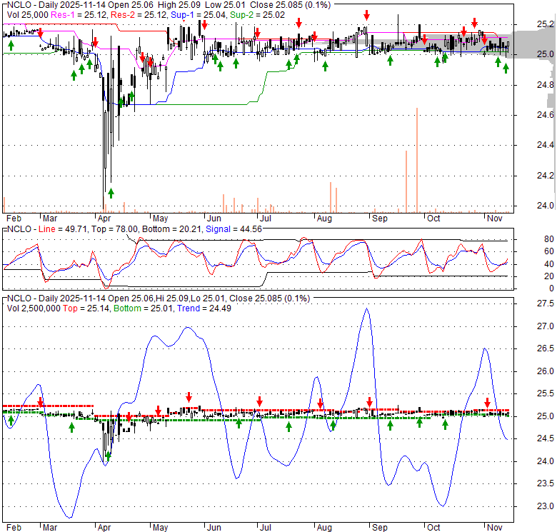 Price has closed above its short-term moving average. Short-term moving average is currently below mid-term; and below long-term moving average. From the relationship between price and moving averages: This stock is NEUTRAL in short-term; and NEUTRAL in mid-long term.[ NCLO ] has closed below upper band by 39.1%. Bollinger Bands are 7.5% wider than normal. The current width of the bands does not suggest anything about the future direction or movement of prices.