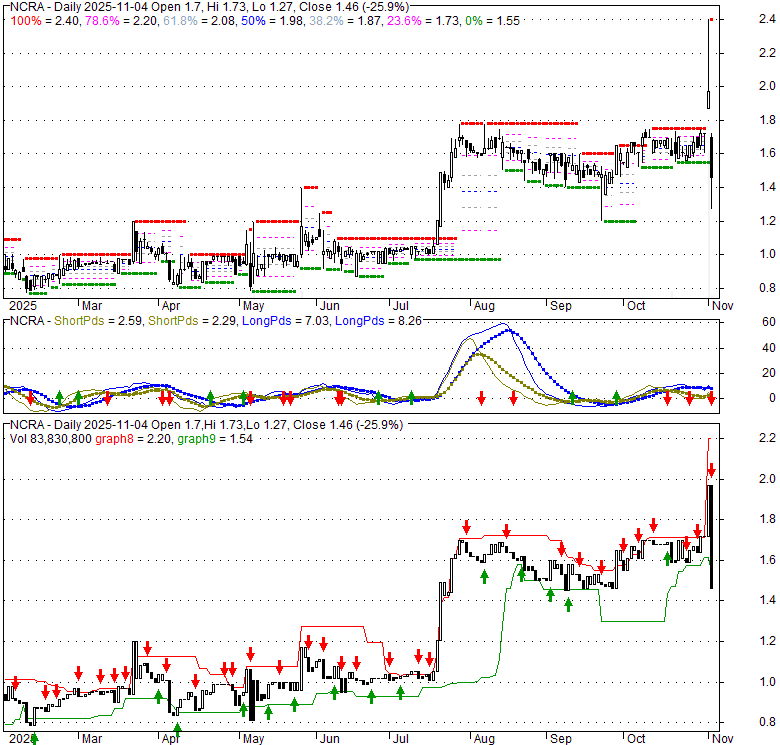 Price has closed below its short-term moving average. Short-term moving average is currently above mid-term; and above long-term moving average. From the relationship between price and moving averages: This stock is NEUTRAL in short-term; and BULLISH in mid-long term.[ NCRA ] has closed above bottom band by 0.9%. Bollinger Bands are 53.8% wider than normal. The large width of the bands suggest high volatility as compared to its normal range. The bands have been in this wide range for 0 days. This is a sign that the current trend might continue.