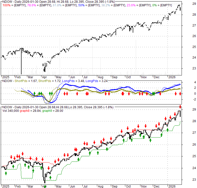 Price has closed below its short-term moving average. Short-term moving average is currently above mid-term; and above long-term moving average. From the relationship between price and moving averages: This stock is NEUTRAL in short-term; and BULLISH in mid-long term.[ NDOW ] has closed above bottom band by 45.3%. Bollinger Bands are 48.4% wider than normal. The large width of the bands suggest high volatility as compared to its normal range. The bands have been in this wide range for 2 days. This is a sign that the current trend might continue.