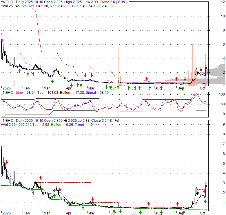 Price has closed above its short-term moving average. Short-term moving average is currently above mid-term; and above long-term moving average. From the relationship between price and moving averages: This stock is BULLISH in short-term; and BULLISH in mid-long term.[ NEHC ] has closed below upper band by 13.5%. Bollinger Bands are 430.7% wider than normal. The large width of the bands suggest high volatility as compared to its normal range. The bands have been in this wide range for 14 days. This is a sign that the current trend might continue.