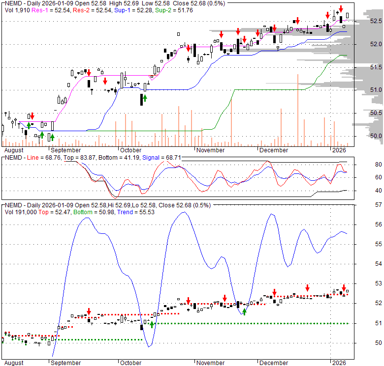 Price has closed above its short-term moving average. Short-term moving average is currently above mid-term; and above long-term moving average. From the relationship between price and moving averages: This stock is BULLISH in short-term; and BULLISH in mid-long term.[ NEMD ] has closed below upper band by 2.9%. Bollinger Bands are 0% narrower than normal.