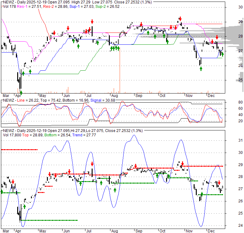 Price has closed above its short-term moving average. Short-term moving average is currently below mid-term; and below long-term moving average. From the relationship between price and moving averages: This stock is NEUTRAL in short-term; and BEARISH in mid-long term.[ NEWZ ] has closed above bottom band by 46.0%. Bollinger Bands are 20.8% narrower than normal. The current width of the bands does not suggest anything about the future direction or movement of prices.