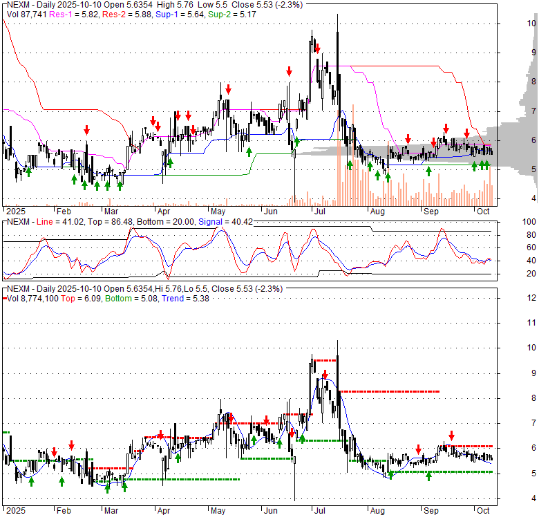 Price has closed below its short-term moving average. Short-term moving average is currently above mid-term; and below long-term moving average. From the relationship between price and moving averages: This stock is NEUTRAL in short-term; and NEUTRAL in mid-long term.[ NEXM ] has closed above bottom band by 14.7%. Bollinger Bands are 76.2% narrower than normal. The narrow width of the bands suggests low volatility as compared to its normal range. The bands have been in this narrow range for 40 bars. This is a sign that the market may be about to initiate a new trend.