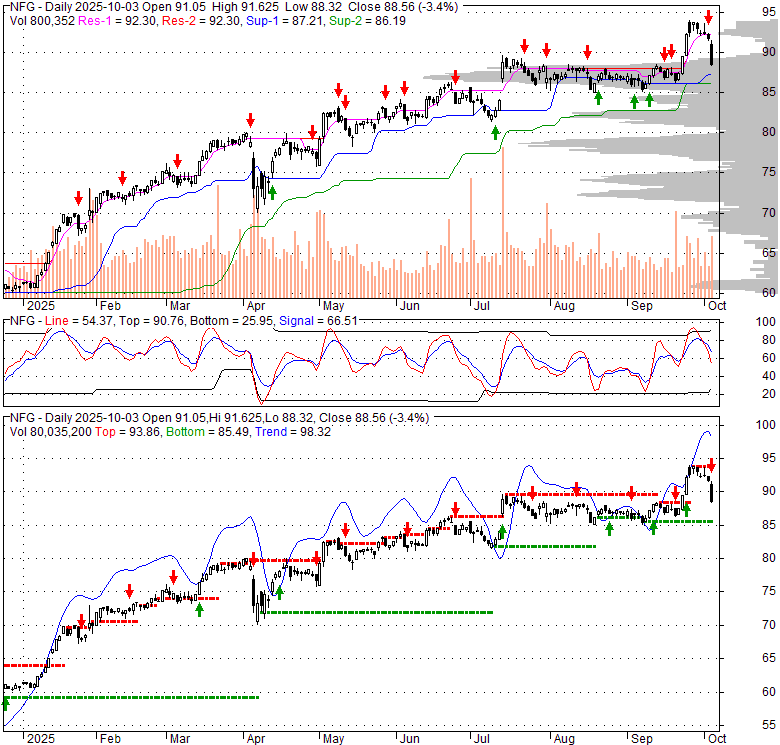 Price has closed below its short-term moving average. Short-term moving average is currently above mid-term; and above long-term moving average. From the relationship between price and moving averages: This stock is NEUTRAL in short-term; and BULLISH in mid-long term.[ NFG ] has closed above bottom band by 36.0%. Bollinger Bands are 105.8% wider than normal. The large width of the bands suggest high volatility as compared to its normal range. The bands have been in this wide range for 6 days. This is a sign that the current trend might continue.