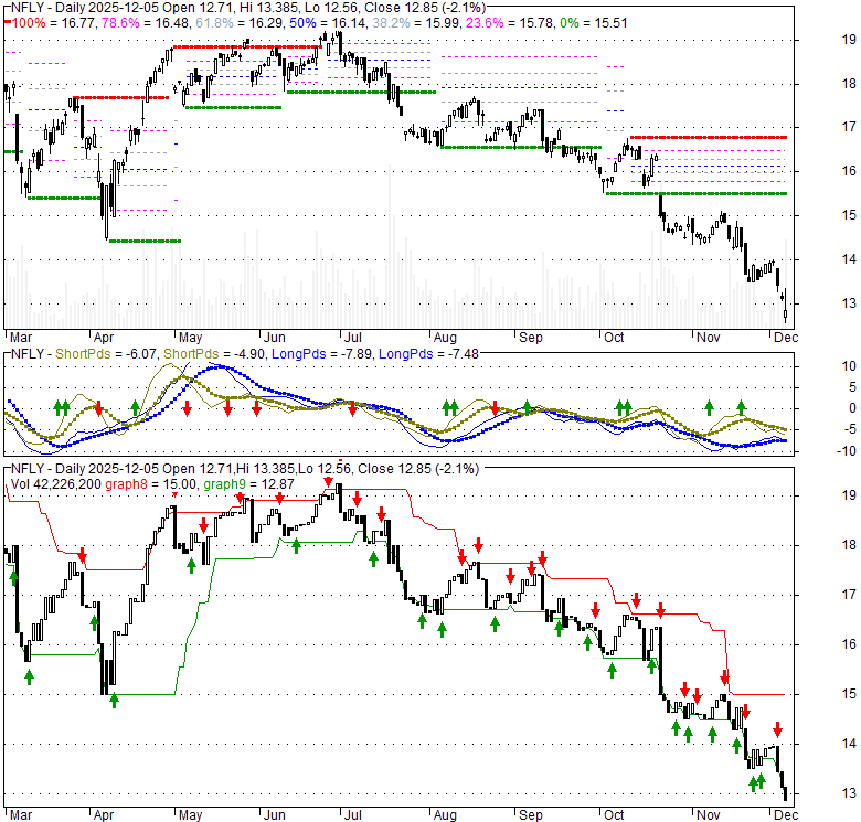 Price has closed below its short-term moving average. Short-term moving average is currently below mid-term; and below long-term moving average. From the relationship between price and moving averages: This stock is BEARISH in short-term; and BEARISH in mid-long term.[ NFLY ] has closed below the lower bollinger band by 0.4%. Although price has broken the lower band and a downside breakout is possible; the most likely direction for [ NFLY ] is to continue within current trading range. Bollinger Bands are 25% wider than normal. The current width of the bands does not suggest anything about the future direction or movement of prices.