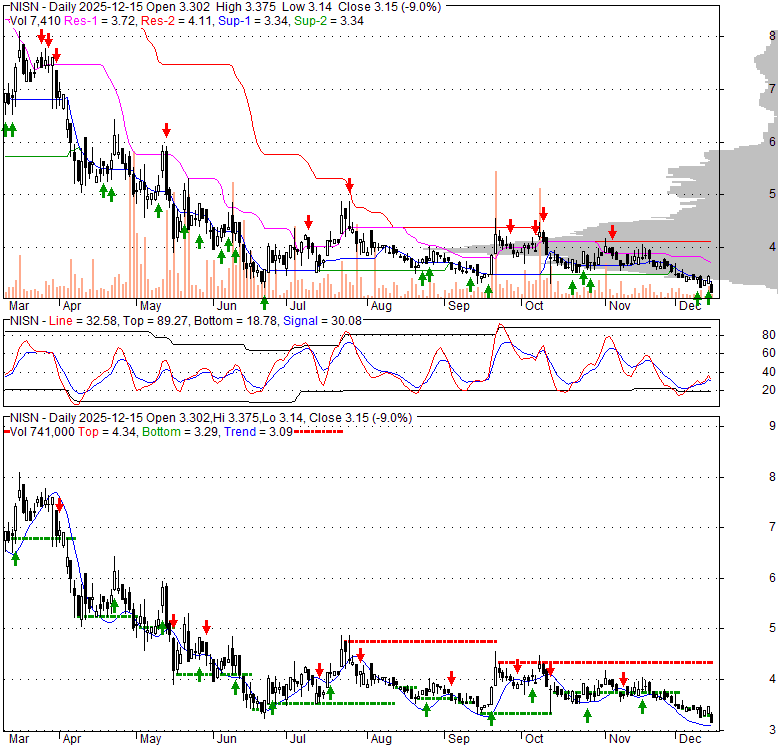 Price has closed below its short-term moving average. Short-term moving average is currently below mid-term; and below long-term moving average. From the relationship between price and moving averages: This stock is BEARISH in short-term; and BEARISH in mid-long term.[ NISN ] has closed above bottom band by 14.6%. Bollinger Bands are 27.8% narrower than normal. The current width of the bands does not suggest anything about the future direction or movement of prices.