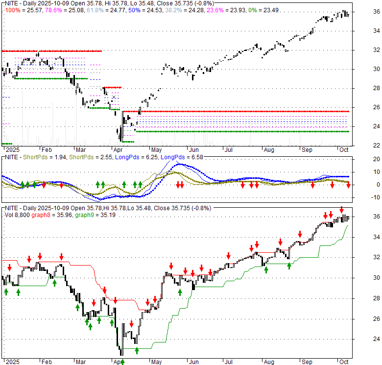 Price has closed below its short-term moving average. Short-term moving average is currently above mid-term; and above long-term moving average. From the relationship between price and moving averages: This stock is NEUTRAL in short-term; and BULLISH in mid-long term.[ NITE ] has closed below upper band by 44.5%. Bollinger Bands are 34.4% narrower than normal. The current width of the bands does not suggest anything about the future direction or movement of prices.