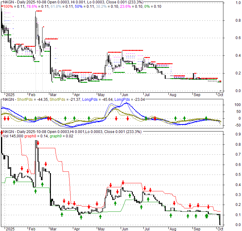 Price has closed below its short-term moving average. Short-term moving average is currently below mid-term; and below long-term moving average. From the relationship between price and moving averages: This stock is BEARISH in short-term; and BEARISH in mid-long term.[ NKGN ] has closed below the lower bollinger band by 11.3%. If price is in a downtrend band; this downward trend might continue. However a short term pullback inside the band is likely. Bollinger Bands are 26.8% wider than normal. The current width of the bands does not suggest anything about the future direction or movement of prices.