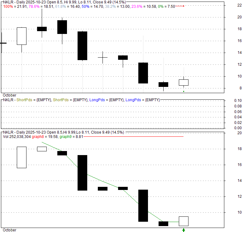 Price has closed below its short-term moving average. Short-term moving average is currently below mid-term; and below long-term moving average. From the relationship between price and moving averages: This stock is NEUTRAL in short-term; and NEUTRAL in mid-long term.[ NKLR ] has closed Bollinger Bands are 0% narrower than normal.