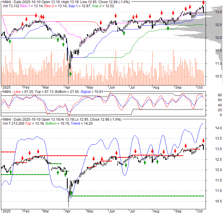 Price has closed below its short-term moving average. Short-term moving average is currently above mid-term; and above long-term moving average. From the relationship between price and moving averages: This stock is NEUTRAL in short-term; and BULLISH in mid-long term.[ NMAI ] has closed above bottom band by 46.8%. Bollinger Bands are 25.3% wider than normal. The current width of the bands does not suggest anything about the future direction or movement of prices.