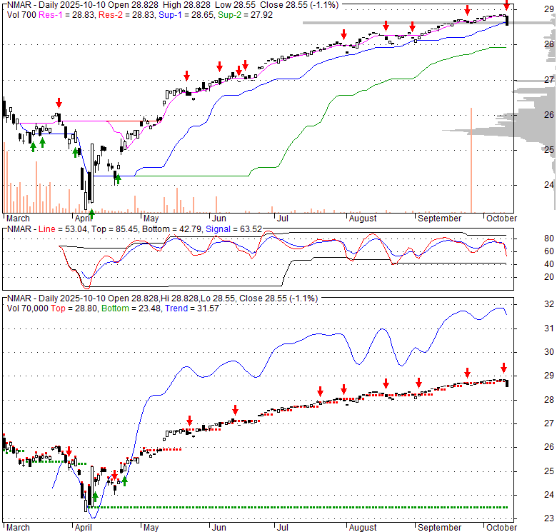Price has closed below its short-term moving average. Short-term moving average is currently above mid-term; and above long-term moving average. From the relationship between price and moving averages: This stock is NEUTRAL in short-term; and BULLISH in mid-long term.[ NMAR ] has closed below the lower bollinger band by 3.5%. If price is in a downtrend band; this downward trend might continue. However a short term pullback inside the band is likely. Bollinger Bands are 38.1% narrower than normal. The current width of the bands does not suggest anything about the future direction or movement of prices.