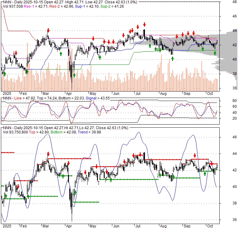 Price has closed above its short-term moving average. Short-term moving average is currently below mid-term; and below long-term moving average. From the relationship between price and moving averages: This stock is NEUTRAL in short-term; and BEARISH in mid-long term.[ NNN ] has closed below upper band by 34.5%. Bollinger Bands are 19.9% narrower than normal. The current width of the bands does not suggest anything about the future direction or movement of prices.