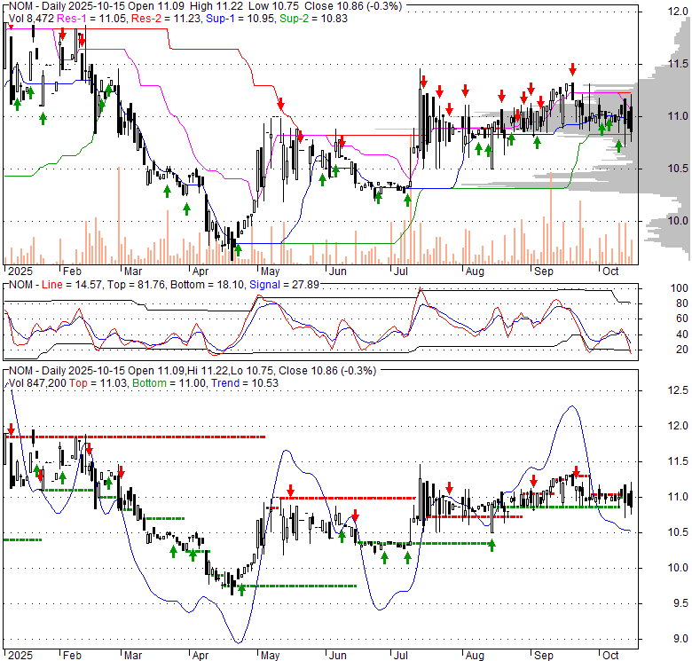 Price has closed above its short-term moving average. Short-term moving average is currently below mid-term; and above long-term moving average. From the relationship between price and moving averages: This stock is NEUTRAL in short-term; and NEUTRAL in mid-long term.[ NOM ] has closed Bollinger Bands are 44.5% narrower than normal. The narrow width of the bands suggests low volatility as compared to its normal range. The bands have been in this narrow range for 4 bars. This is a sign that the market may be about to initiate a new trend.
