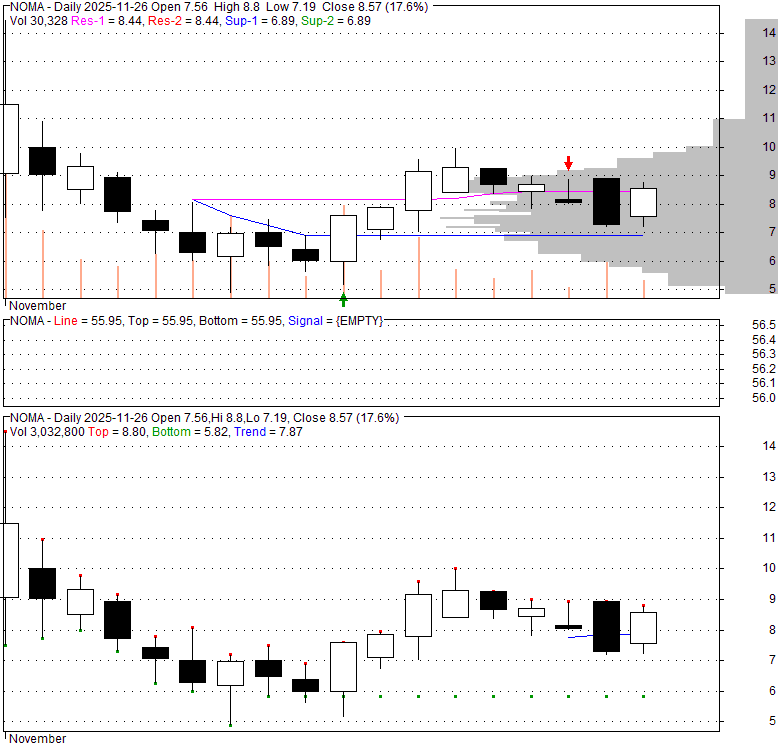 Price has closed above its short-term moving average. Short-term moving average is currently below mid-term; and below long-term moving average. From the relationship between price and moving averages: This stock is NEUTRAL in short-term; and NEUTRAL in mid-long term.[ NOMA ] has closed below upper band by 28.7%. Bollinger Bands are 0% narrower than normal.