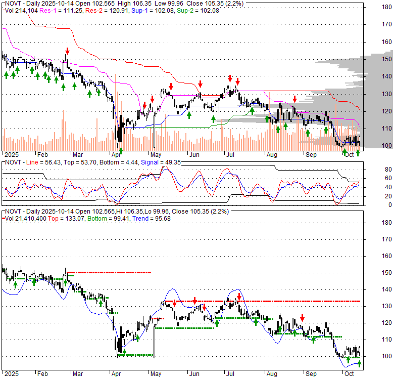 Price has closed above its short-term moving average. Short-term moving average is currently below mid-term; and below long-term moving average. From the relationship between price and moving averages: This stock is NEUTRAL in short-term; and BEARISH in mid-long term.[ NOVT ] has closed below upper band by 11.8%. Bollinger Bands are 42.4% narrower than normal. The narrow width of the bands suggests low volatility as compared to its normal range. The bands have been in this narrow range for 1 bars. This is a sign that the market may be about to initiate a new trend.