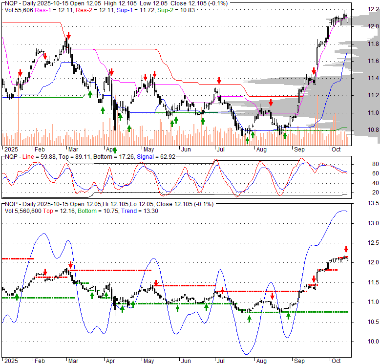 Price has closed below its short-term moving average. Short-term moving average is currently above mid-term; and above long-term moving average. From the relationship between price and moving averages: This stock is NEUTRAL in short-term; and BULLISH in mid-long term.[ NQP ] has closed below upper band by 34.1%. Bollinger Bands are 9.5% narrower than normal. The current width of the bands does not suggest anything about the future direction or movement of prices.