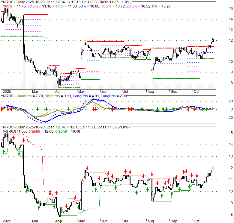 Price has closed above its short-term moving average. Short-term moving average is currently above mid-term; and above long-term moving average. From the relationship between price and moving averages: This stock is BULLISH in short-term; and BULLISH in mid-long term.[ NRDS ] has closed below upper band by 15.9%. Bollinger Bands are 81.1% wider than normal. The large width of the bands suggest high volatility as compared to its normal range. The bands have been in this wide range for 2 days. This is a sign that the current trend might continue.